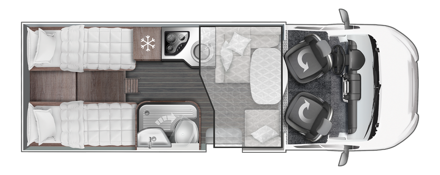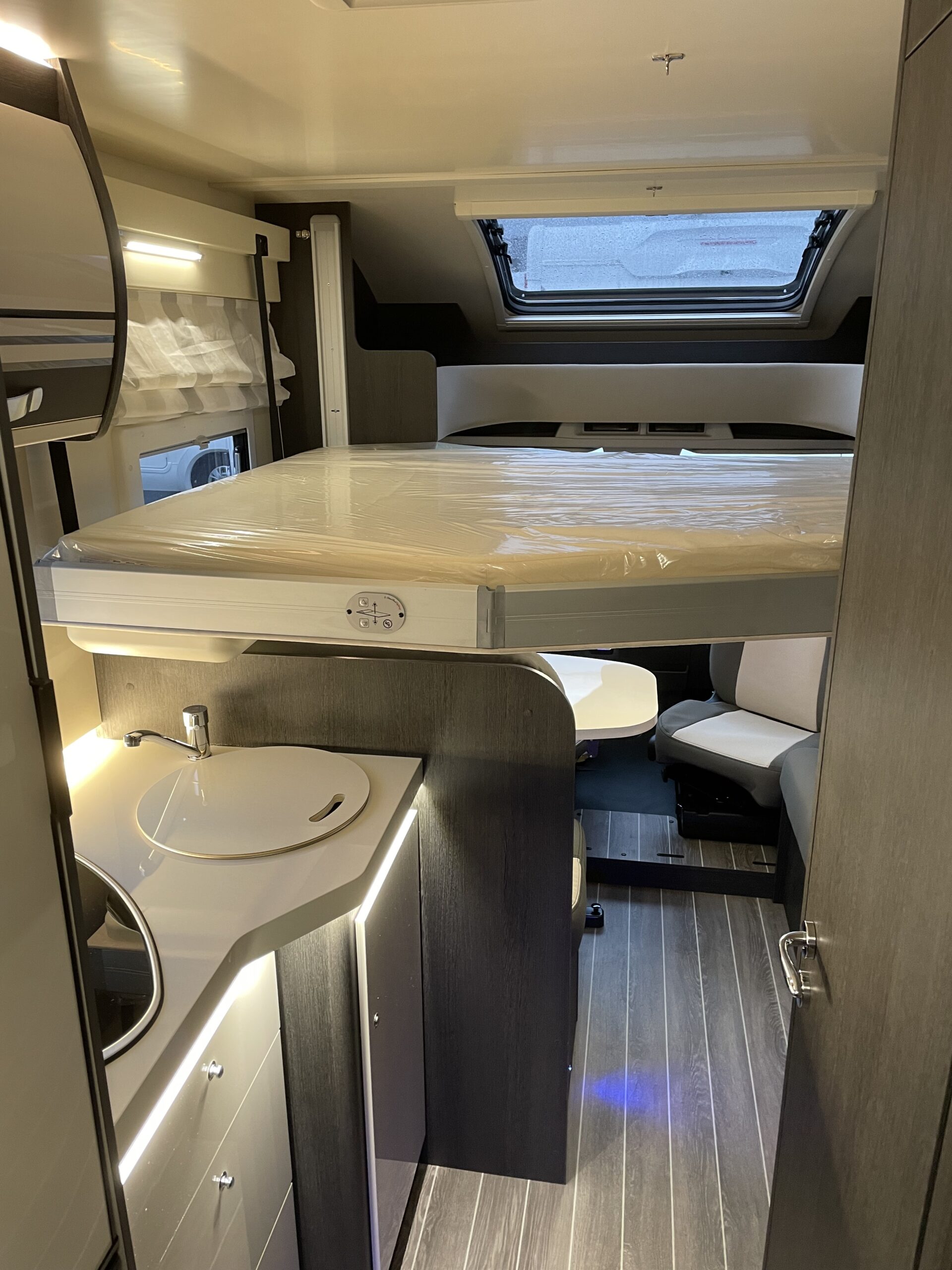 Denne autocamper har 5 selepladser og 5 sengepladser. Rigtig godt indrettet med store enkeltsenge bagerst, der nemt kal laves til en endnu større dobbeltseng. Over siddegruppen er der en rigtig fin sænkeseng der gør opredningen til natten meget nem.