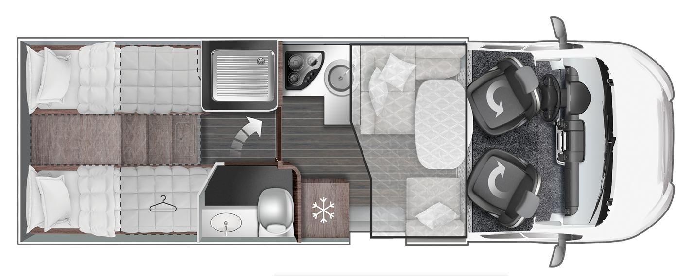 Denne autocamper har hele 5 selepladser og 5 sovepladser. Denne grundløsning har det hele, enkeltsenge som nemt kan omdannes til stor dobbeltseng samt dobbelt sænkeseng over siddegruppen. Toiletrum som er separat med separat bruserum overfor, vinkelkøkken.