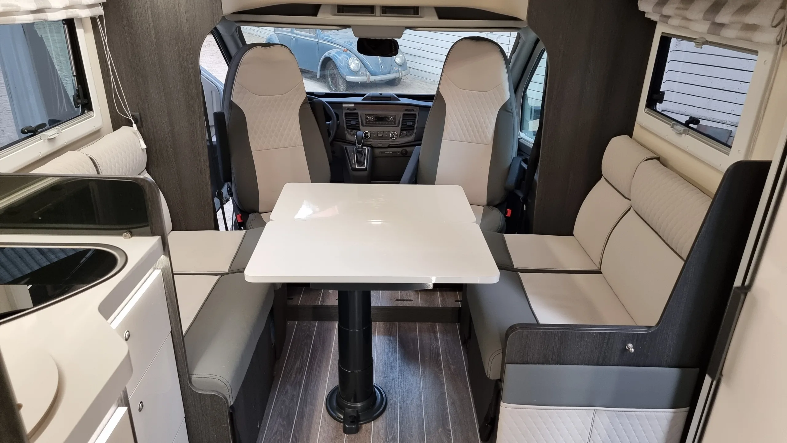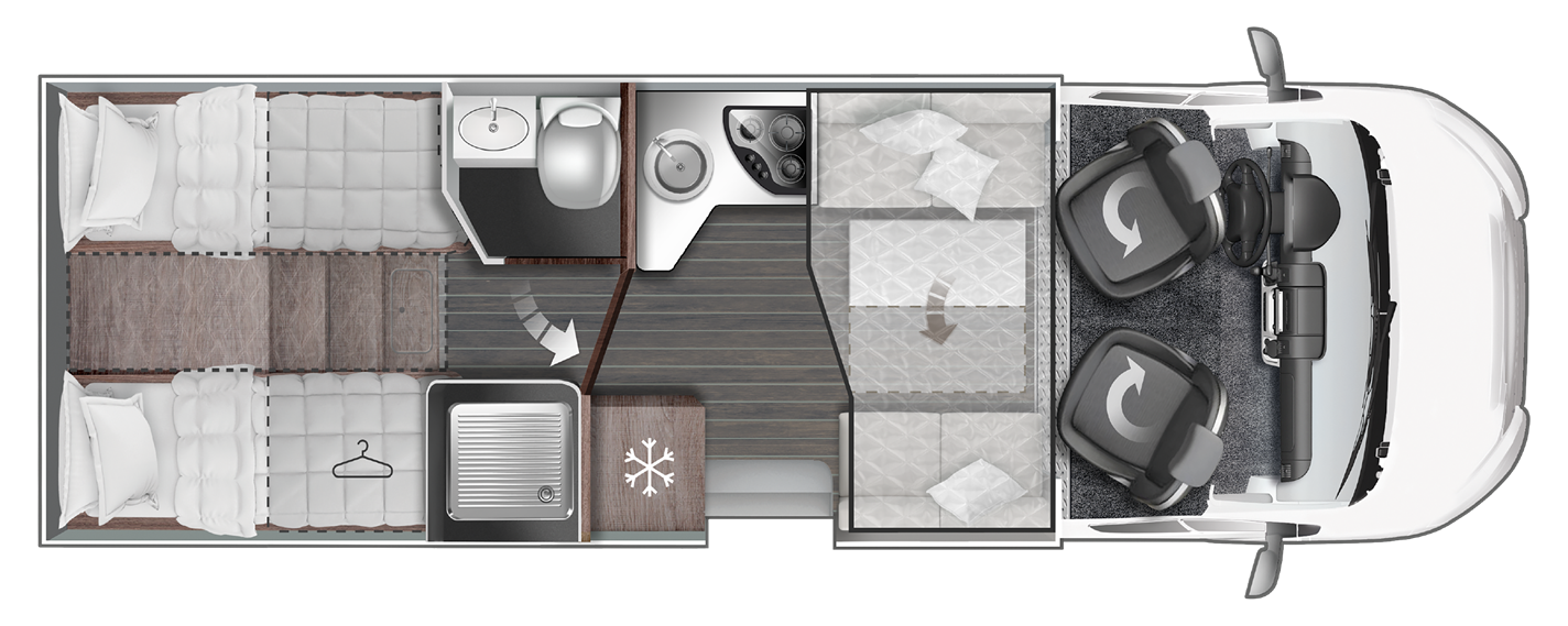 Denne autocamper har 4 selepladser og 4 sengepladser. Den har face to face siddegruppe, der gør at autocamperen virker dejlig rummelig. Bagerst har den 2 store enkeltsenge , der nemt laves om til en endnu større dobbeltseng. Derudover er kan siddegruppen forrest i vognen nemt omdannes til sovepladser.